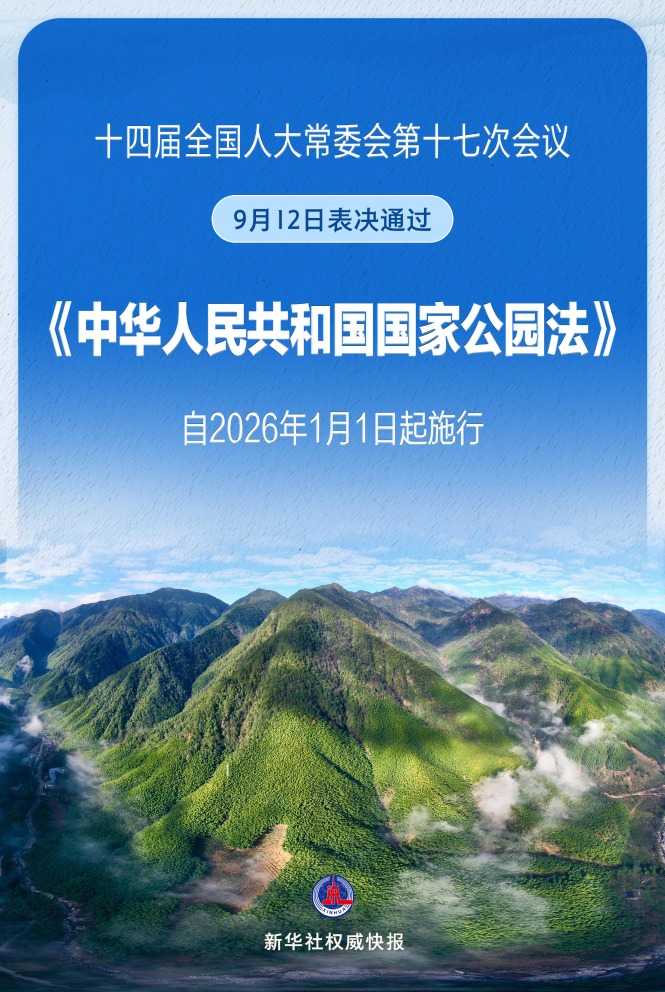 十四届全国人大常委会第十七次会议表决通过《中华人民共和国国家公园法》,自2026年1月1日起施行,共7章63条,规定建立统一管理体制,坚持一体化保护。