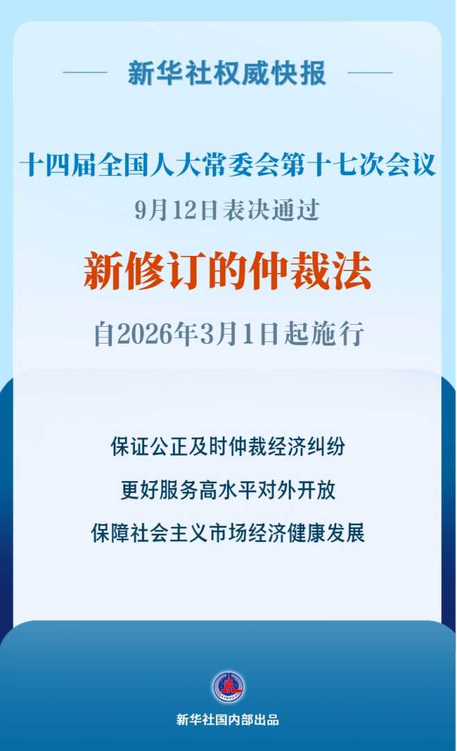 十四届全国人大常委会第十七次会议9月12日表决通过新修订的仲裁法,共8章96条,自2026年3月1日起施行。这部仲裁法律的修订,标志着我国在法治化建设方面迈出了重要一步,为经济纠纷的化解提供了更为坚实的法律保障。