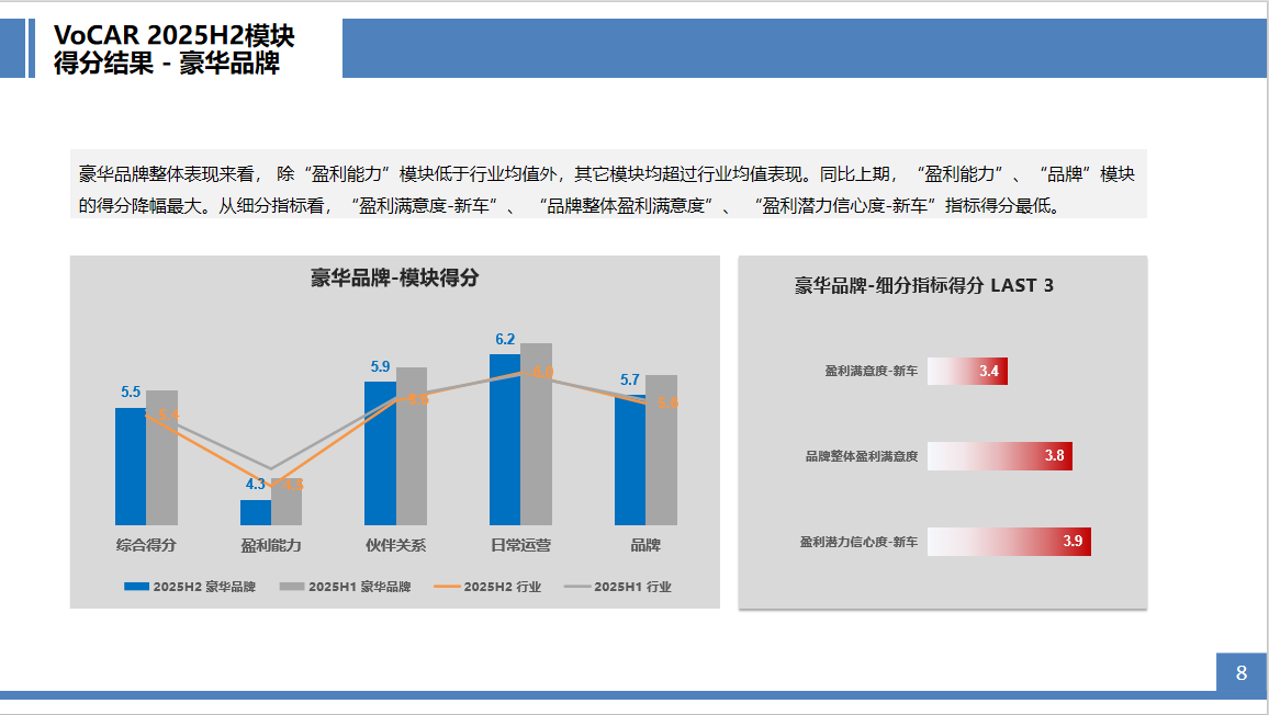 中国汽车流通协会发布《VoCAR中国汽车经销商之声2025H2夏季版》报告,显示行业综合得分跌至5.4分,创七连降新低。豪华品牌首当其冲,盈利能力下降,奔驰品牌面临新能源转型考验,市场竞争激烈,转型迫在眉睫。