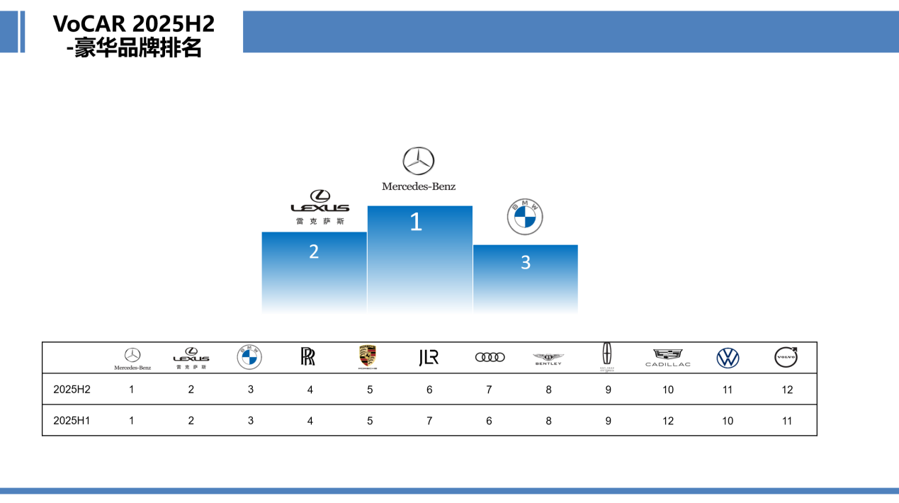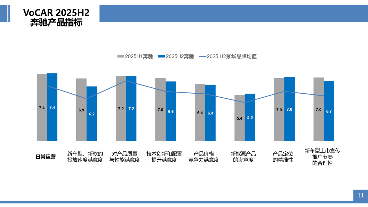 奔驰品牌本期调研综合得分6.6分,较2025H1的6.7分小幅下滑,在豪华品牌全面承压态势下保持相对领先,汽车品牌竞争激烈。