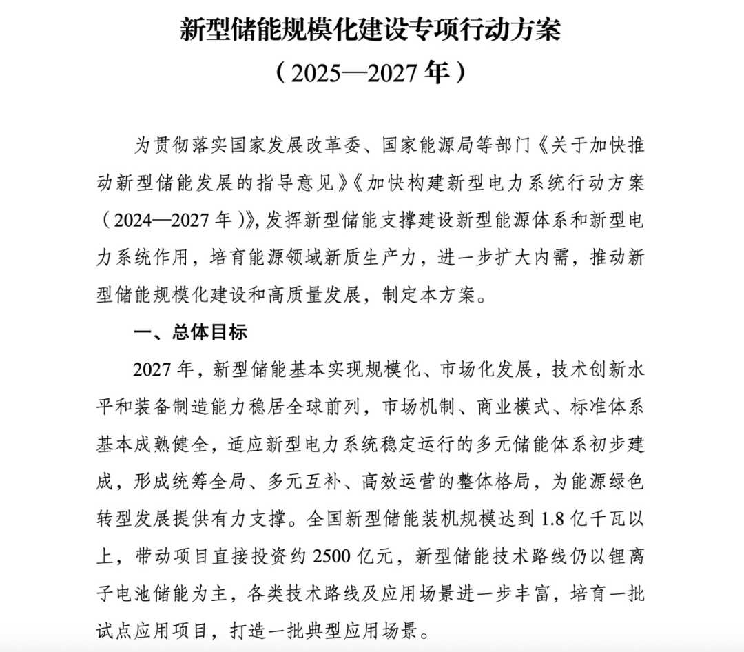 《行动方案》提出,2025-2027年三年内全国储能新增装机容量超过1亿千瓦;到2027年,全国新型储能装机规模达到1.8亿千瓦(180 GW)以上,带动项目直接投资约2500亿元。国家能源局称,该目标统筹了新能源消纳、电力保供需求和各类调节性资源规划建设情况。绿色和平气候与能源资深项目主任姚祎表示:“这意味着当前装机规模将近乎翻倍,也标志着中国新型储能发展从规划阶段迈向大规模发展阶段(储能发展阶段)。”