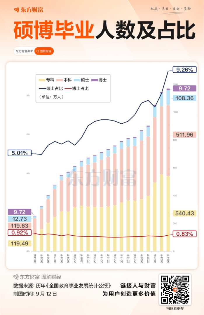近年中国硕博毕业生的数量占比变化,或也说明某种程度上硕士学历相比博士更具“性价比”。近二十年,中国的硕士毕业生人数从2004年的12.73万人升至2024年的108.36万人,增幅高达751%,是同期博士生数量增幅的两倍以上;硕士毕业生在高校毕业生总数中的占比,也从二十年前的5.01%升至2024年的9.26%,而博士毕业生的占比始终维持在0.8%左右,这一对比反映了学历就业的新趋势。