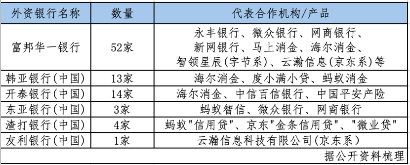 7月以来,富邦华一银行、韩亚银行(中国)、开泰银行(中国)、东亚银行(中国)、渣打银行(中国)等6家外资行密集披露互联网贷款合作名单。最引人瞩目的是,富邦华一银行合作机构数量高达52家,成为目前披露合作方最多的外资行。据第一财经梳理,外资行的合作方高度集中于蚂蚁、京东、字节跳动等头部流量平台,且涵盖民营银行、持牌消费金融公司、增信机构等多类主体。