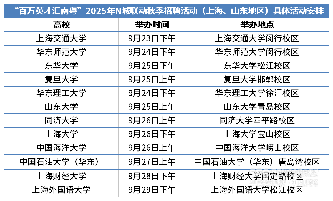9月12日,南方财经记者从深圳市人社局获悉,作为“百万英才汇南粤”2025年N城联动秋季招聘活动首发站之一,深圳将联合汕尾、河源,组织腾讯、华为、比亚迪等企业携超2万个优质岗位,于9月23日—29日直抵上海、山东两地12所知名高校,招聘盛宴即将开启。