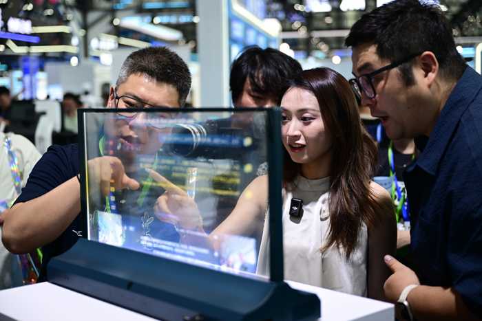 2025年4月26日,观众在第三届中国(安徽)科技创新成果转化交易会上体验一款多语种AI透明屏。新华社记者周牧摄