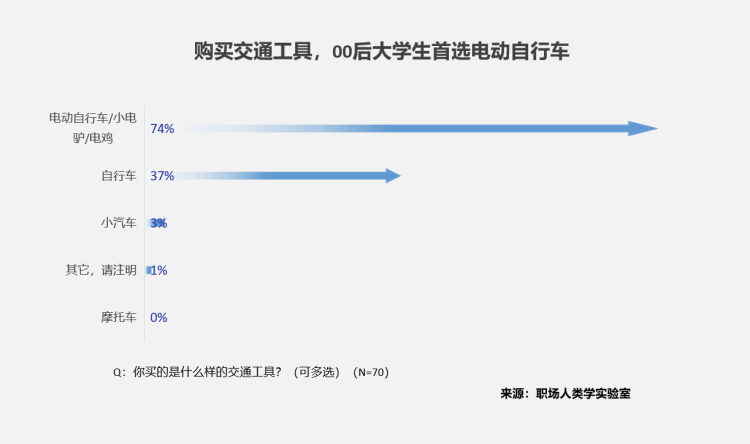 如今许多高校在郊区兴建新校区,校园面积大、教学楼分散,步行耗时久、自行车费力,电动自行车的“省力便捷”优势凸显。加之郊区出行配套不如市区完善,电动自行车既能满足校内通勤,也能支撑短途校外购物、聚餐,成为“校园生活神器”。数据显示,74%的学生选择了电动自行车作为校园交通工具,成为主流选择,远高于其他选项。