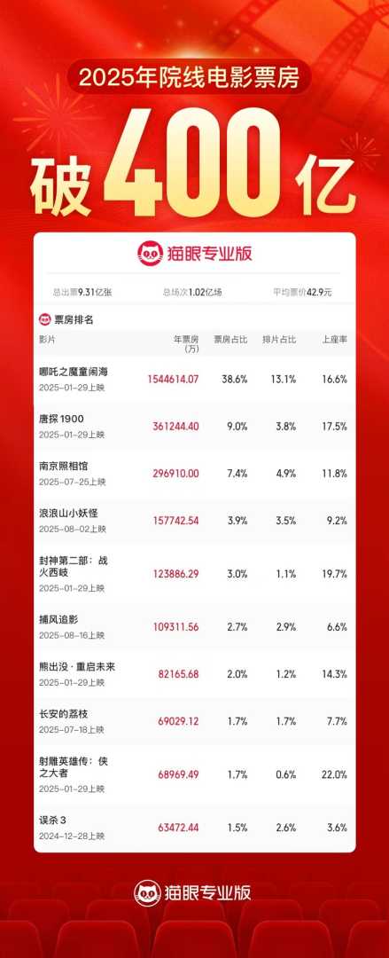 据猫眼专业版数据,2025年度电影市场票房已破400亿元,较2024年提前76天,国产电影票房占比超88.8%,展现电影市场活力与国产电影崛起。