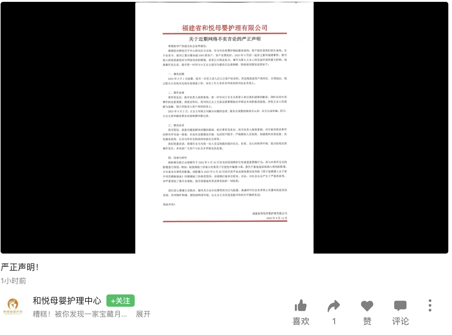 9月13日,针对网传“福州月子会所男性负责人半夜闯入产妇房间”这一社会关注事件,福建和悦母婴护理中心发布声明称,2025年9月1日凌晨,公司一名员工误入已入住客户的房间,其发现误进客户房间后,立刻退出,现已配合公安机关完成全部调查工作。该名工作人员并非网传的公司法定负责人。此次事件引发了社会对母婴护理安全的广泛关注。事件发生后,公司负责人高度重视母婴安全,第一时间向王女士及其家人表达我们诚挚的歉意。同时启动对该事件的全面调查。调查完毕后,公司向王女士全面还原事情始末并制定未来的整改措施,如加强员工培训、完善房间管理流程等,争取王女士的理解与谅解,现已开除误入客户房间的员工。2025年9月2日,王女士对公司解决问题的态度、服务及调整措施表示认同,双方达成和解。