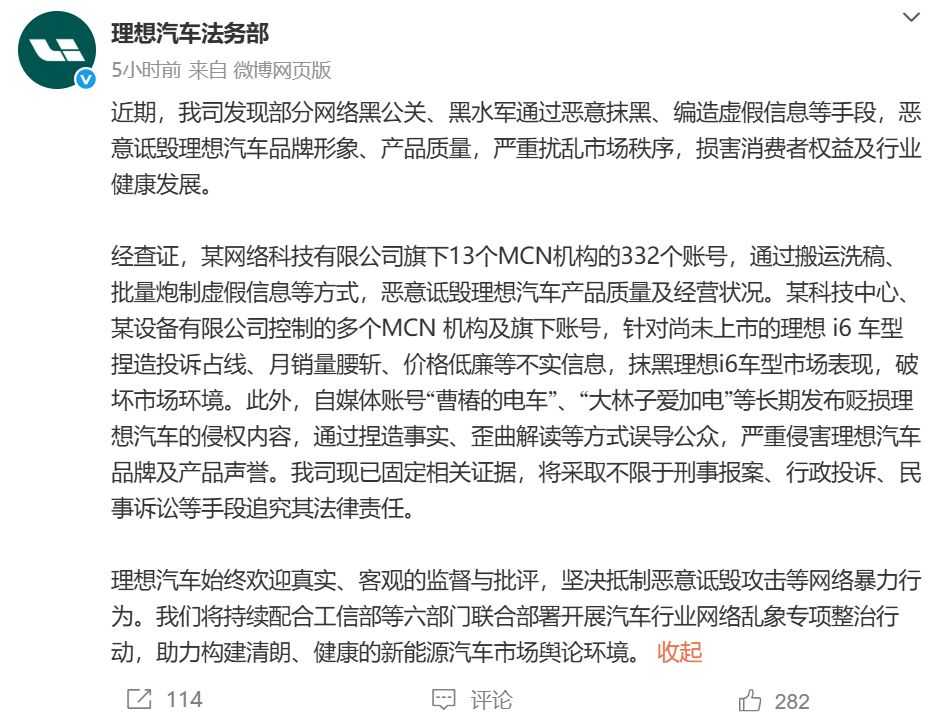 经查证,某网络科技有限公司旗下13个MCN机构的332个账号,通过搬运洗稿、批量炮制虚假信息等方式,恶意诋毁理想汽车产品质量及经营状况。某科技中心、某设备有限公司控制的多个MCN 机构及旗下账号,针对尚未上市的理想 i6 车型捏造投诉占线、月销量腰斩、价格低廉等不实信息,抹黑理想i6车型市场表现,破坏市场环境。此外,自媒体账号“曹椿的电车”、“大林子爱加电”等长期发布贬损理想汽车的侵权内容,通过捏造事实、歪曲解读等方式误导公众,严重侵害理想汽车品牌及产品声誉。我司现已固定相关证据,将采取不限于刑事报案、行政投诉、民事诉讼等手段追究其法律责任。