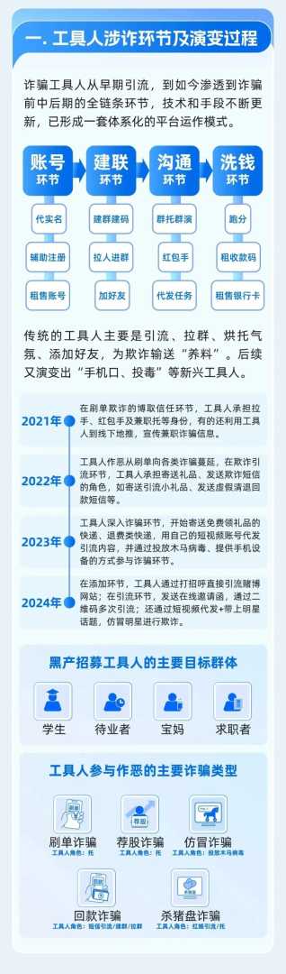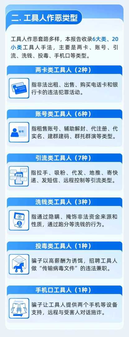 此前,微信安全中心发布《工具人帮助犯罪研究报告》,从演变过程及作恶类型讲述“工具人”作案手法,希望通过手法科普,帮助大家识别相关套路,拒做电诈“工具人”。