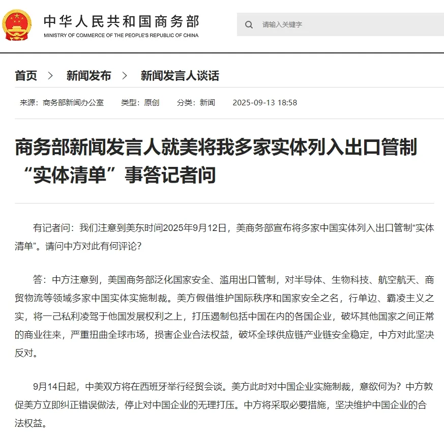 美东时间2025年9月12日,美商务部宣布将多家中国实体列入出口管制“实体清单”。商务部回应称,美方泛化国家安全、滥用出口管制,严重扭曲全球市场,中方坚决反对并将采取必要措施维护企业权益。