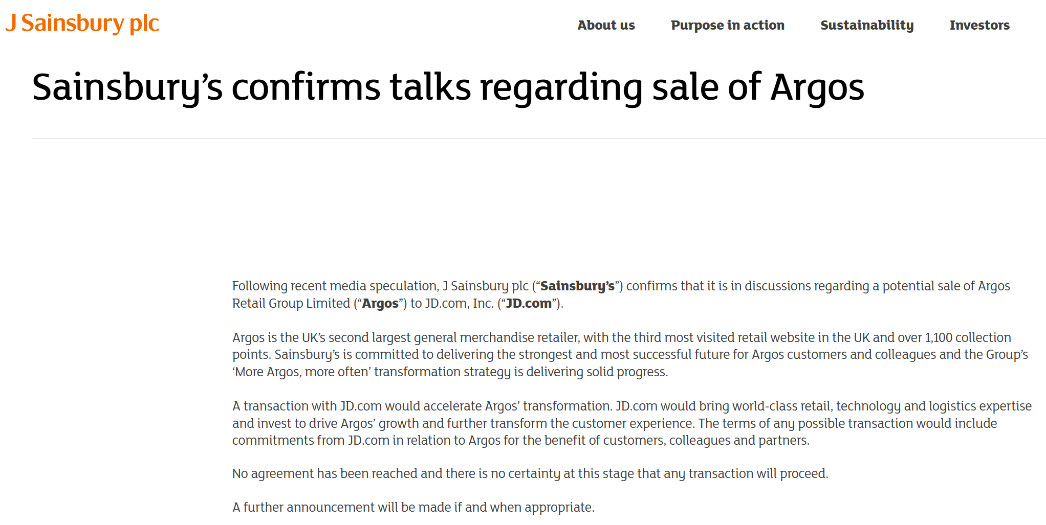 财联社9月14日讯(编辑史正丞)英国第二大连锁超市集团森宝利(J Sainsbury plc)周六发布公告,确认正在就出售子公司Argos的潜在事宜与京东进行讨论,此举或成为京东全球化布局的重要一步。