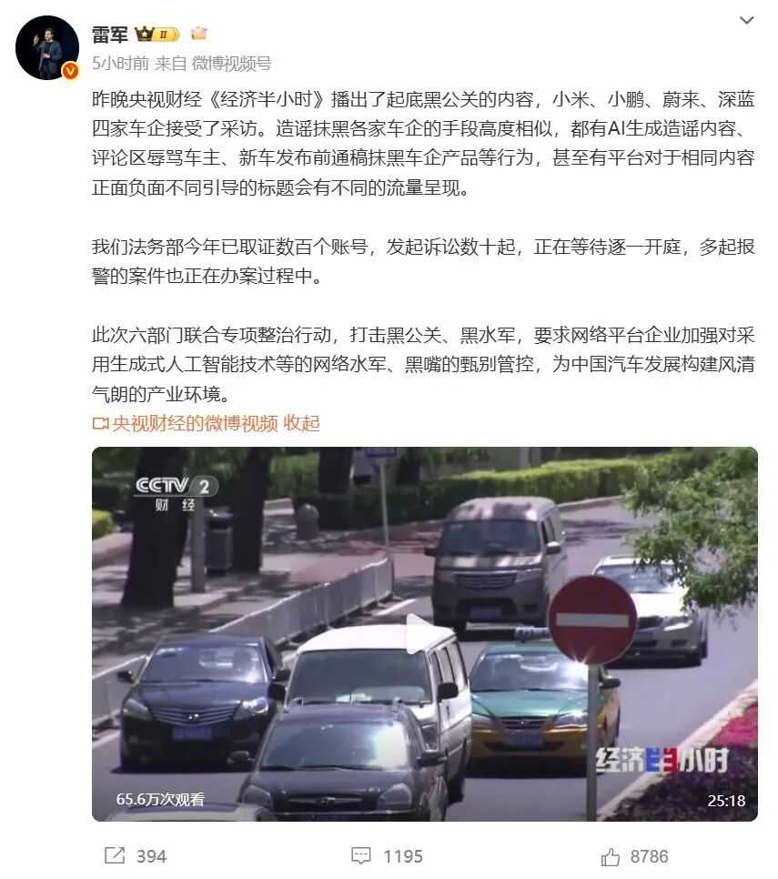 雷军就央视财经《经济半小时》起底黑公关内容发声,小米等四家车企接受采访。六部门联合整治黑公关,要求平台加强管控,净化网络环境,保护企业声誉。
