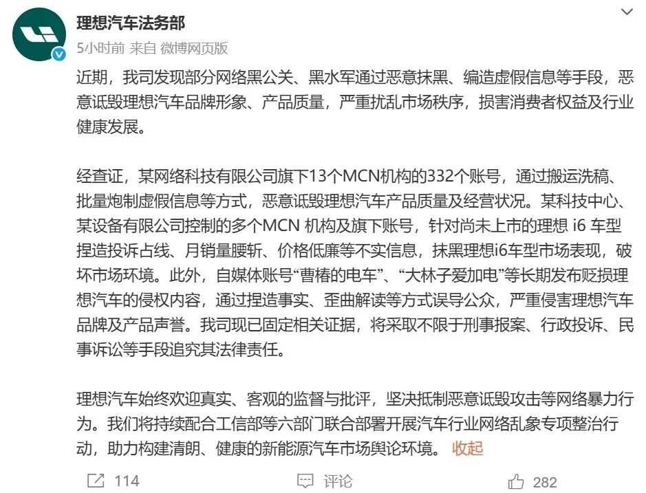 此前,蔚来、小鹏汽车、理想汽车、鸿蒙智行法务部也发文打击黑公关。