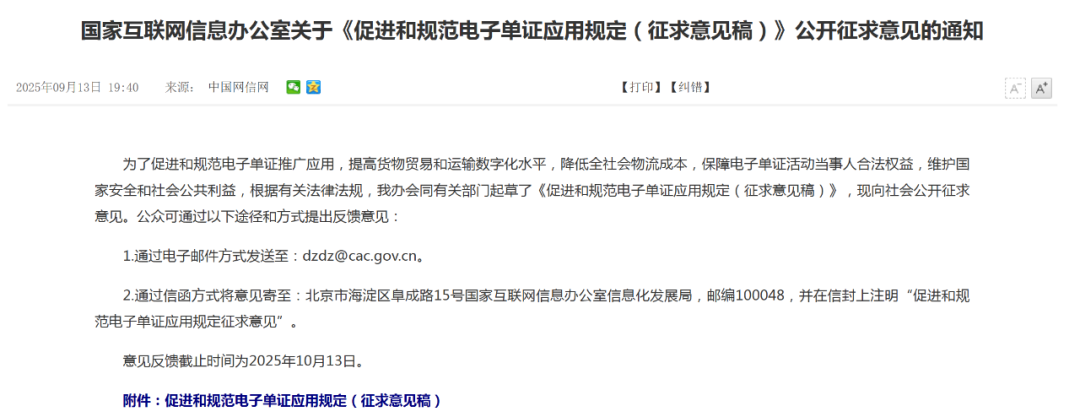 《促进和规范电子单证应用规定(征求意见稿)》公开征求意见,推动贸易数字化
