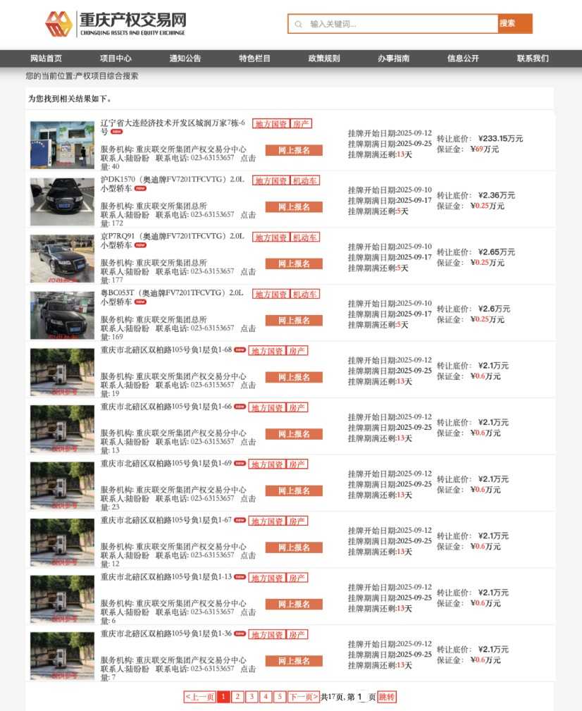 9月10日至12日,西南证券在重庆联合产权交易所新挂牌一批项目,根据券商中国记者不完全统计,逾70个挂牌项目涉及房产、车位、车辆等,转让底价合计近500万元,凸显资产处置的市场活跃度。
