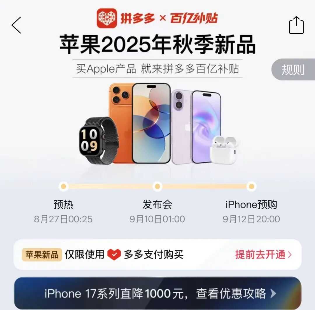 苹果新品火爆,拼多多百亿补贴后价格显著下降。iPhone 17系列开售直降,引发全球抢购狂潮,京东预约总量破700万。苹果官网因流量过载卡顿,市场热度高涨。