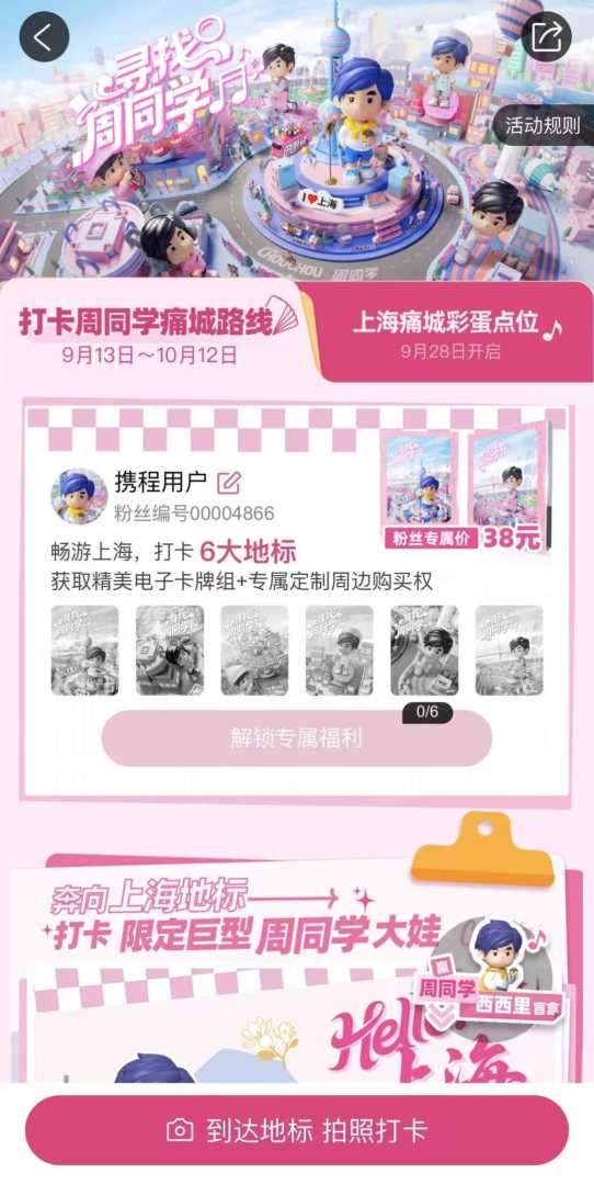 活动在上海六个地标性地点——东方明珠、上海博物馆、静安大悦城、永源路街区、徐家汇美罗城及半马苏河公园摆放周同学巨型肖像,设立多处周同学IP主题场景及快闪店。游客可在各点位通过打卡互动、抽奖活动及“票根经济”等多种方式参与其中,享受沉浸式的文娱消费体验。