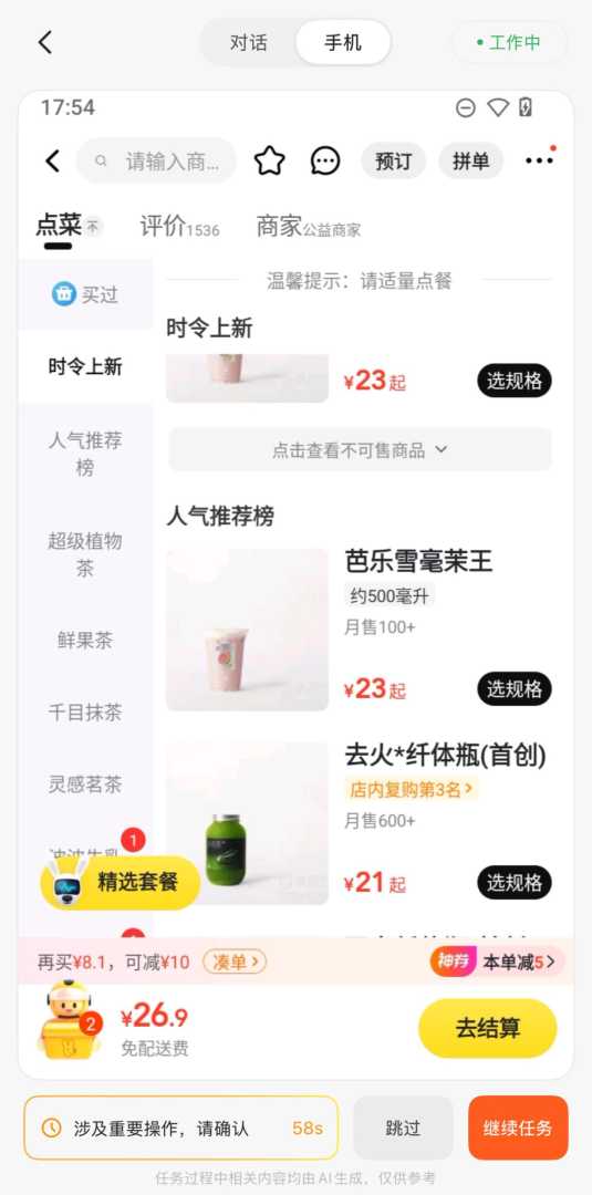 智谱希望智能体支持跨应用操作,但受制于各家平台之间的壁垒,采用了可视化交互图形界面(GUI)的运作方式。以美团点外卖这一场景为例,在下达指令后,AutoGLM会模拟用户点击、滑动、输入等操作,依次完成搜索餐馆、选择菜品、加入购物车、提交订单并付款的全过程。和“小美”相比,AutoGLM耗时显著更长,但过程更接近真实地在应用中操作美团App。