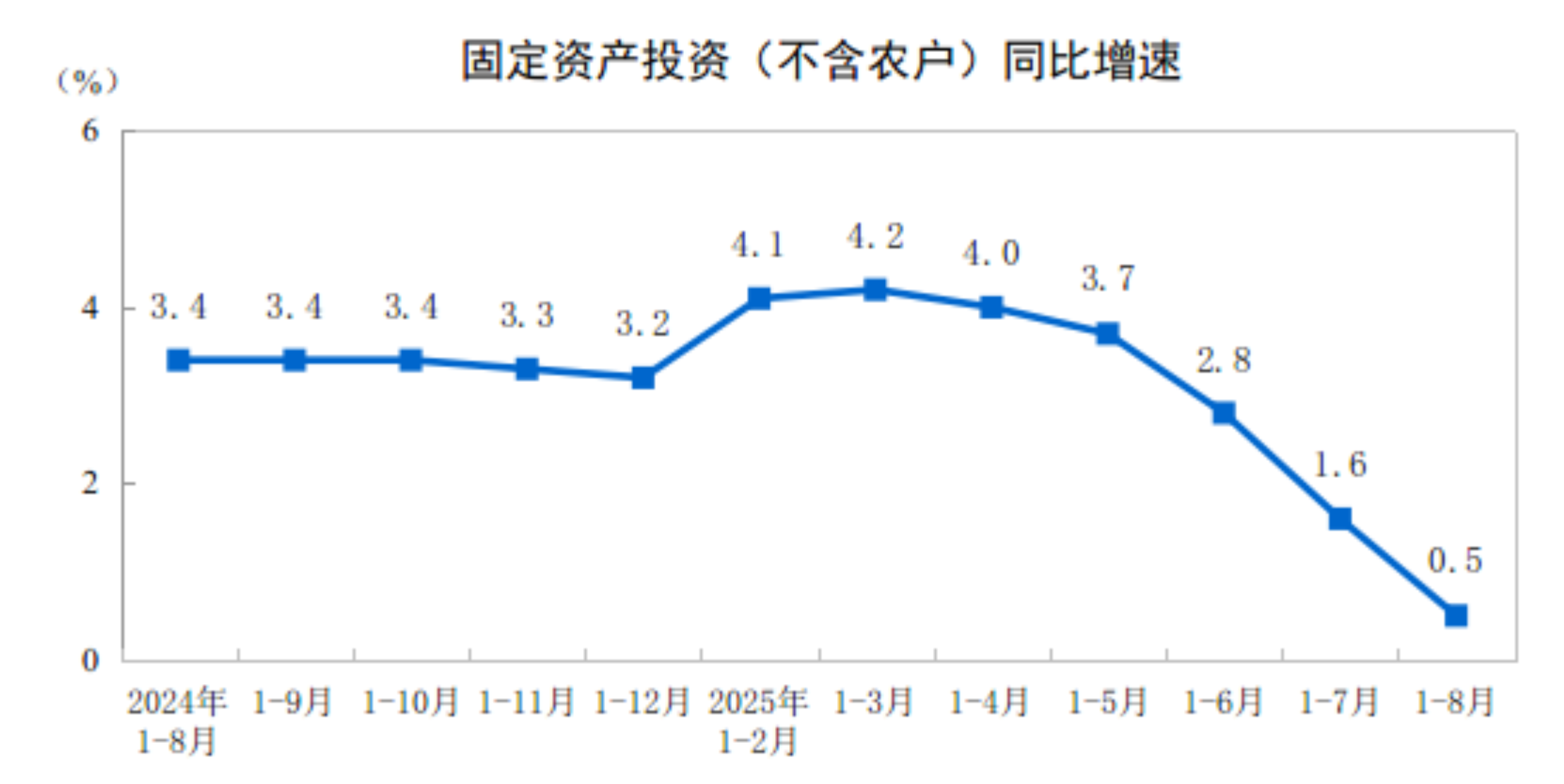 国家统计局数据显示,2025年1-8月全国固定资产投资同比增长0.5%,民间投资下降2.3%,8月环比降0.20%,反映投资市场短期波动。
