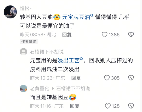 2021年,金龙鱼在年报中又表示,当年发布的中国品牌力指数品牌排行榜,“金龙鱼”以731.2分第11年蝉联食用油品牌榜榜首,“胡姬花”“香满园”和“元宝”分列第5、第6和第9位。对于“元宝”转基因大豆油,部分网上消费者表现出了担忧的情绪,有的表示“懂的都懂,几乎可以说是最便宜的油了”,有的批评西贝,“卖高端餐厅的价格,用地摊的元宝,我家做粮油批发的,真没想到西贝还用元宝”。