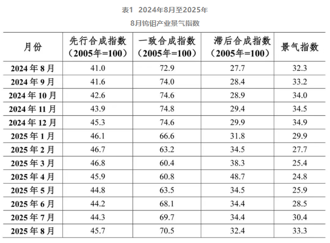 2025年8月,中国钨钼产业景气指数升至33.3,较7月上升2.9个百分点,连续4月呈上升趋势。先行指数也上升至45.7,显示行业发展积极信号,市场需求增长。