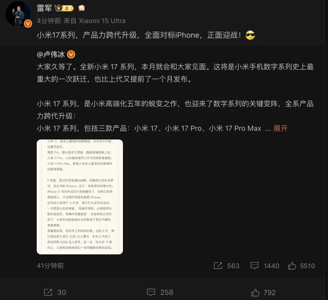 雷军转发该微博并表示:“小米17系列,产品力跨代升级,全面对标iPhone,正面迎战!”