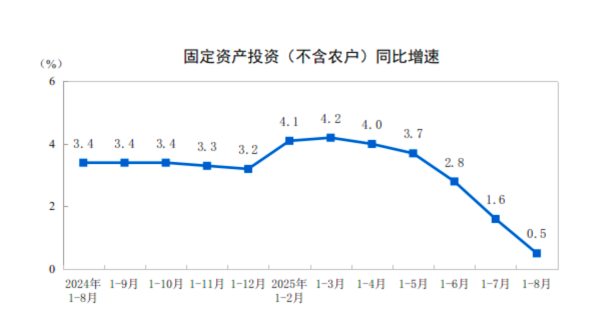 投资方面,1-8月份,全国固定资产投资(不含农户)326111亿元,同比增长0.5%;扣除房地产开发投资,全国固定资产投资增长4.2%。8月份,固定资产投资(不含农户)环比下降0.20%。分领域来看,1-8月份,制造业投资同比增长5.1%,较前7个月回落1.1个百分点。王青表示,外部经贸环境波动对国内制造业投资的影响还有可能进一步显现,“反内卷”政策推进也可能对产能过剩行业投资产生抑制效应,预计下半年制造业投资增速将延续下行态势,全年增速将在5.5%左右,比去年全年增速下行3.7个百分点。四季度大规模设备更新支持资金规模有望上调,进而对制造业投资形成有力支撑。