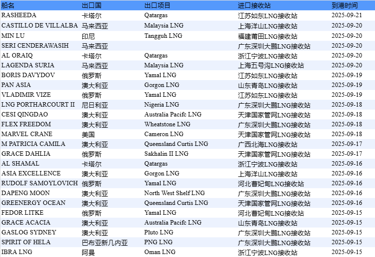 E-Gas系统LNG船期预测数据显示,9月15日-9月21日当周,中国将通过沿海LNG接收站进口LNG25船,预计进口量约182万吨,预示着未来一周LNG进口量的大幅增长。