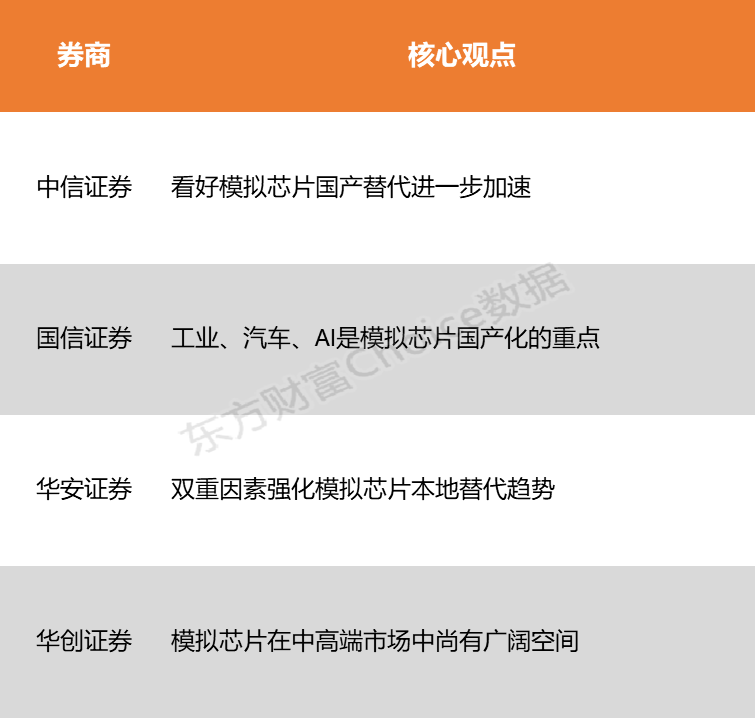 中信证券表示,本次反倾销调查主要聚焦通用接口和栅极驱动芯片,前期布局较多厂商;更加需要关注的是中长期整个模拟芯片板块国产替代趋势,更多厂商有望受益。国信证券指出,从(模拟芯片)下游应用领域来看,工业、汽车、AI是国际大厂布局的重点领域,也是国产化的重点。