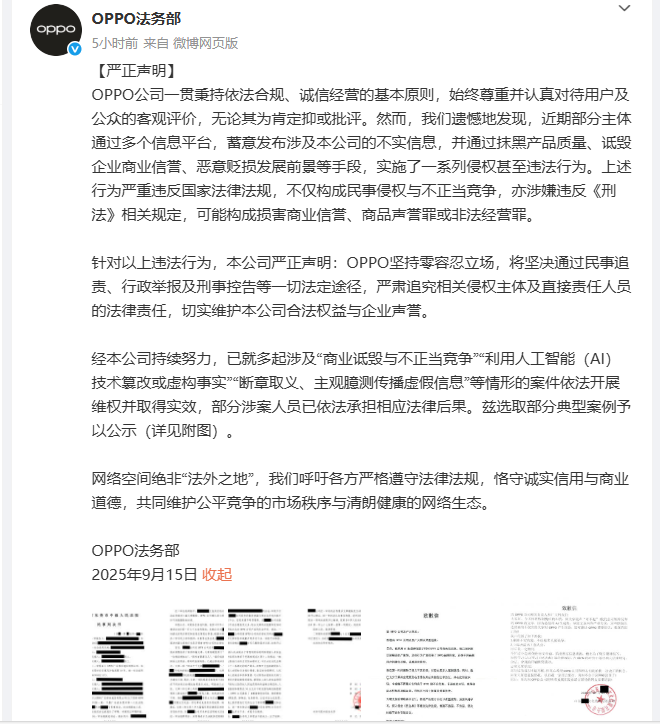 9月15日,OPPO法务部在其微博账户发布声明称,近期部分主体通过多个信息平台,蓄意发布涉及本公司的不实信息,并通过抹黑产品质量、诋毁企业商业信誉、恶意贬损发展前景等手段,实施了一系列侵权甚至违法行为。上述行为严重违反国家法律法规,不仅构成民事侵权与不正当竞争,亦涉嫌违反《刑法》相关规定,可能构成损害商业信誉、商品声誉罪或非法经营罪。这些违法行为严重扰乱了市场秩序,损害了企业合法权益。