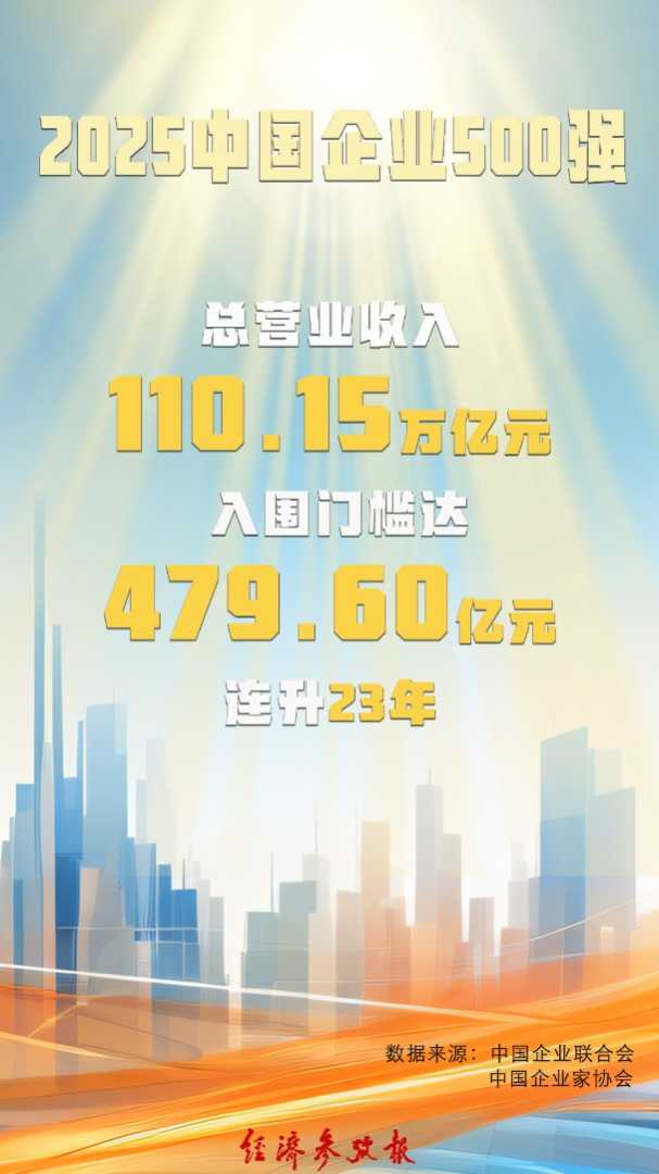 9月15日,中国企业联合会、中国企业家协会连续第24次向社会发布“中国企业500强”榜单显示,国家电网有限公司、中国石油天然气集团有限公司、中国石油化工集团有限公司分列榜单前3位,展现了企业营收实力。2025中国企业500强榜单以2024年企业营业收入作为入围标准,总营收达110.15万亿元,较上年增加,入围门槛实现23连升,达479.60亿元。