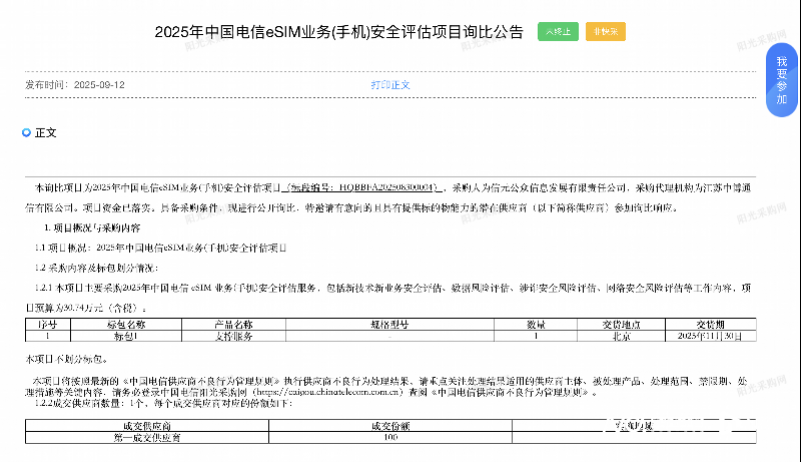 9月15日,南都湾财社记者获悉,中国电信开始启动2025年中国电信eSIM业务(手机)安全评估项目询比,这一举措标志着eSIM技术商业化进程加速。根据中国电信阳光采购网信息,本项目主要采购2025年中国电信eSIM业务(手机)安全评估服务,包括新技术新业务安全评估、数据风险评估、涉诈安全风险评估、网络安全风险评估等工作内容,项目预算为30.74万元(含税)。