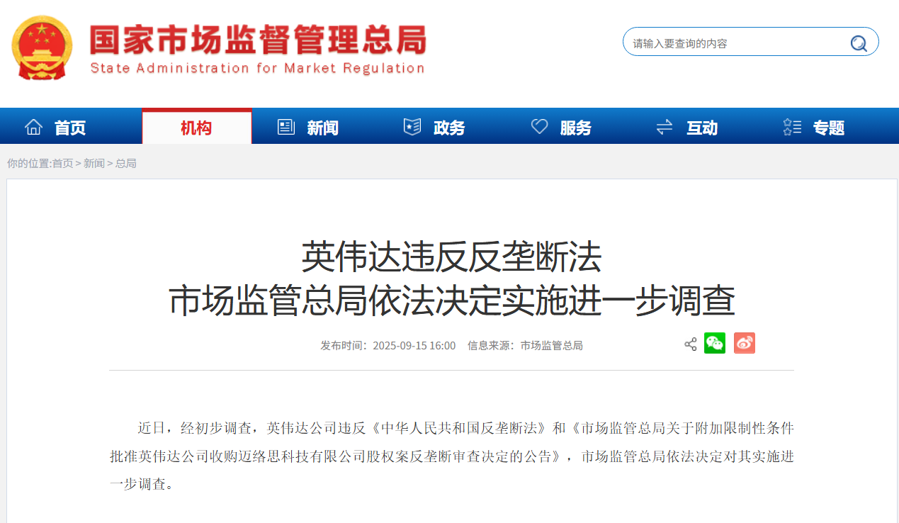 9月15日,国家市场监督管理总局(以下简称“市场监管总局”)通报,因英伟达(NVDA)违反《中华人民共和国反垄断法》及2020年收购迈络思案附加限制性条件的规定,决定对其启动进一步反垄断调查。