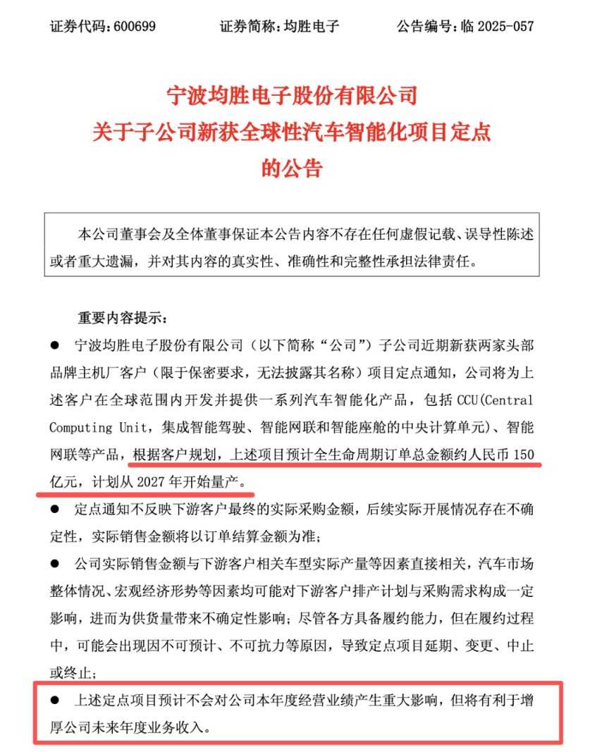 在公告大额订单的同时,均胜电子也提示了两点风险。一方面,定点通知不反映下游客户最终的实际采购金额,后续开展情况存在不确定性,实际销售金额将以订单结算金额为准。