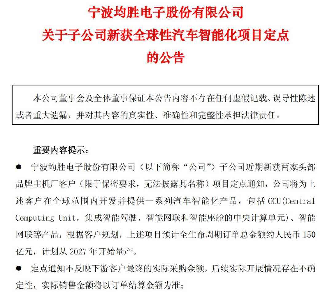 均胜电子公告称,限于保密要求,无法披露这两家头部品牌主机厂的名称,且定点通知不反映下游客户最终的实际采购金额,后续实际开展情况存在不确定性,实际销售金额将以订单结算金额为准。