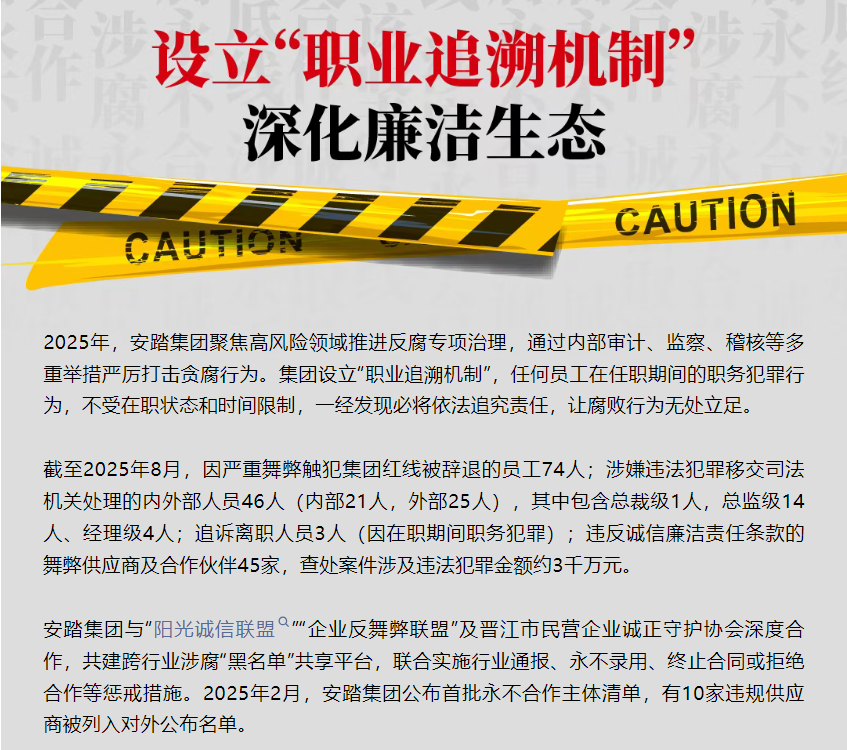 2025年安踏集团聚焦高风险领域推进反腐,截至8月,因严重舞弊被辞退员工74人,涉嫌违法犯罪移交司法机关46人,追诉离职人员3人,查处舞弊供应商及合作伙伴45家,涉及金额约3千万元。