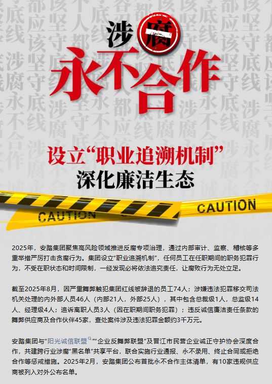 安踏集团与“阳光诚信联盟”“企业反舞弊联盟”及晋江市民营企业诚正守护协会深度合作,共建跨行业涉腐“黑名单”共享平台,联合实施行业通报、永不录用、终止合同或拒绝合作等惩戒措施。2025年2月,安踏集团公布首批永不合作主体清单,有10家违规供应商被列入对外公布名单。企业内控机制和廉洁文化建设进一步增强。