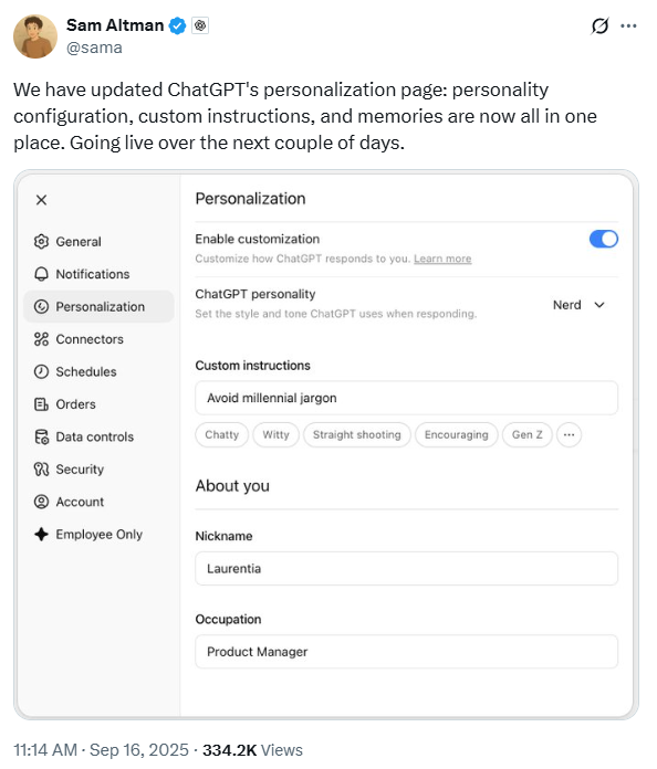 9月16日OpenAI宣布更新ChatGPT个性化页面,整合个性配置、自定义指令和记忆功能,旨在提升AI交互流畅度与对话连贯性,更新将于未来几天内上线。
