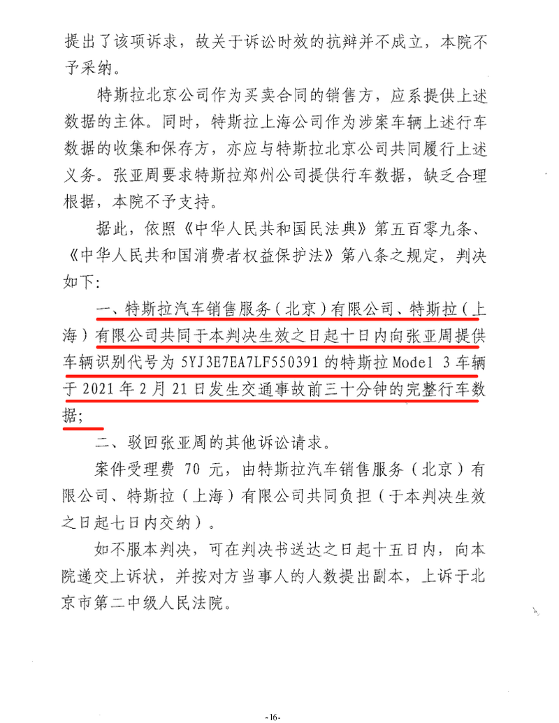 “特斯拉车顶维权女车主”与特斯拉之间的法律诉讼有了新进展。9月16日,“特斯拉车顶维权女车主”张女士向新京报贝壳财经记者出示北京市大兴区人民法院的一份民事判决书显示,法院判决特斯拉北京公司于判决生效之日起10日内应向张女士提供车辆于2021年2月21日发生交通事故前30分钟的完整行车数据,此举强化了消费者知情权保障。