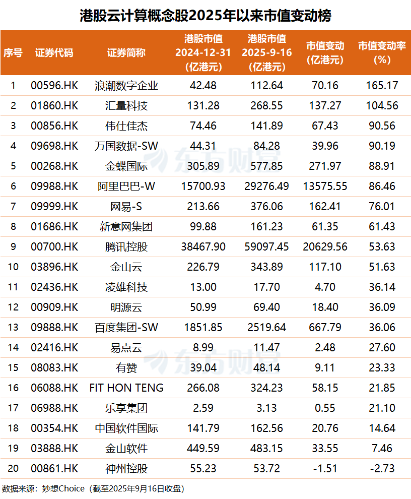 从市场表现看,截至9月16日收盘,阿里巴巴-W年内市值增长超万亿港元,增幅达86.46%,而港股云计算板块也实现了年内逾80%的增幅。一图速览港股云计算概念股2025年以来市值变动: