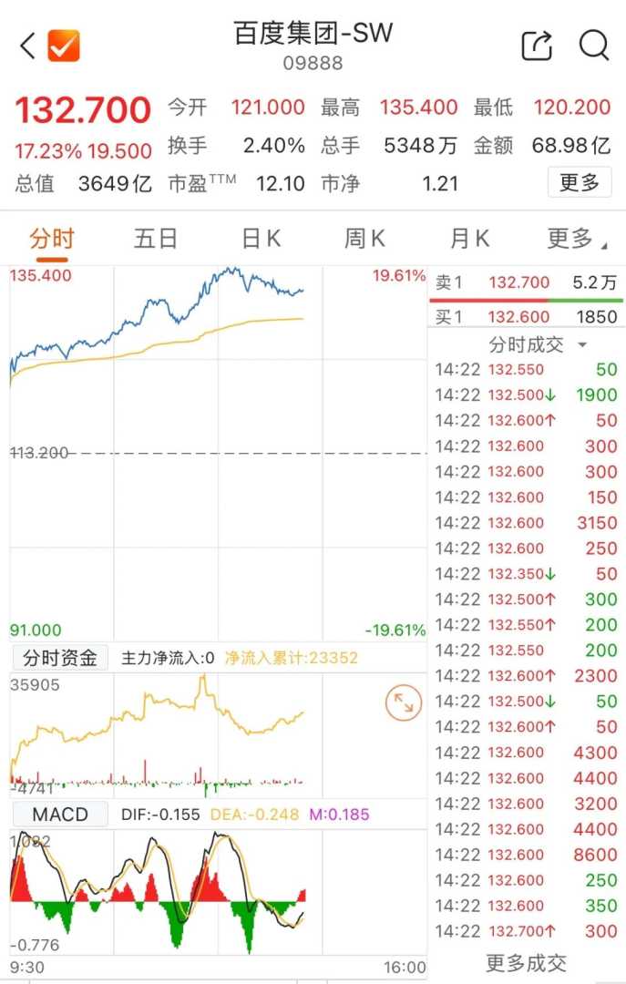 港股9月17日午后持续冲高,截至发稿,恒生科技指数大涨超4%,恒生指数涨超1.6%。恒生科技指数成分股中,百度股价大涨近20%,这一强劲表现无疑为AI概念股注入了一剂强心针。在AI技术浪潮中,百度作为科技巨头,其股价波动备受市场关注。