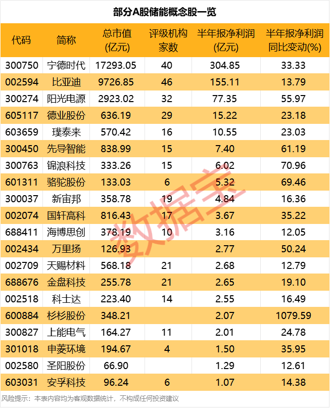据证券时报·数据宝统计,上半年净利润规模逾1亿元,且同比增速超过10%的储能概念股,共计20只,储能概念股业绩表现亮眼。