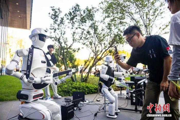 近日,一位参观者在2025互联网岳麓大会上拍摄乐队机器人。中新网记者唐小晴摄