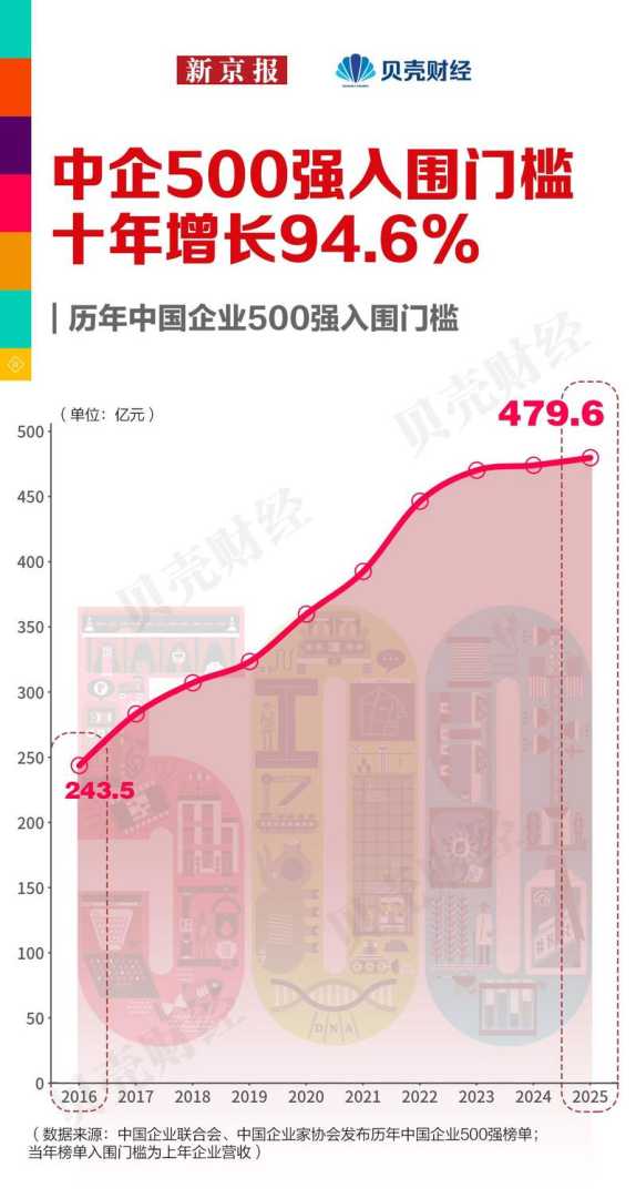 新京报贝壳财经梳理历年中企500强数据发现,“进入中国企业500强”可拆解为三步:跨过门槛、做大营收、锁定排名。对于企业而言,跻身榜单第一步是跨越营收门槛。2025年,“入场券”营收要求达479.6亿元,较上年提升5.79亿元。这道门槛连续23年上升,从2016年不足250亿元到如今逼近480亿元,累计增幅约94.6%。这意味着,企业若想进入榜单,营收增长不仅要顺应宏观经济大势,还必须比竞争者扩张更快,在市场竞争中脱颖而出。