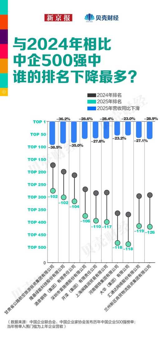 进入榜单后,企业还要锁定排名并释放上榜效应。榜单不仅是一次数据统计,更是一场企业间的排名竞争。根据2025年榜单,部分企业排名分化显著。上升最快的新华人寿凭借营收同比高达224.8%的增长,较上年提升215个位次,成为今年最大黑马。山东招金集团等企业也依托行业景气度回升或产业链优势,实现超过50%的营收增幅,带动排名大幅跃升。而甘肃省公航旅等企业营收大幅下滑三至四成,排名分别下挫超百位,反映出不同行业在市场周期中的不同表现。
