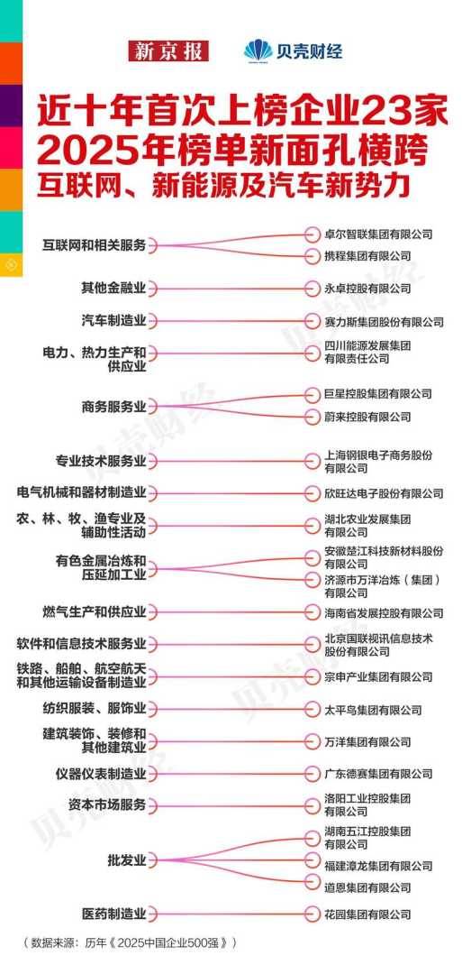 新京报贝壳财经记者梳理历年榜单数据,2025年榜单中,有23家企业在近十年新入榜单。新上榜企业体现出近十年以来数字经济与绿色产业的蓬勃发展,包括卓尔智联、携程等互联网和信息服务公司,赛力斯、蔚来等新能源汽车代表,以及欣旺达等新能源电池制造商。同时,能源结构调整下,地方能源集团也在逐渐壮大。从行业结构看,新晋企业横跨互联网、汽车制造、新材料、能源、消费、金融等多个领域,既映射出中国经济转型升级带来的新机遇,也反映了区域性国企、民营企业在不同赛道上抓住发展窗口的能力,预示着中国企业500强未来更加多元化的发展方向。