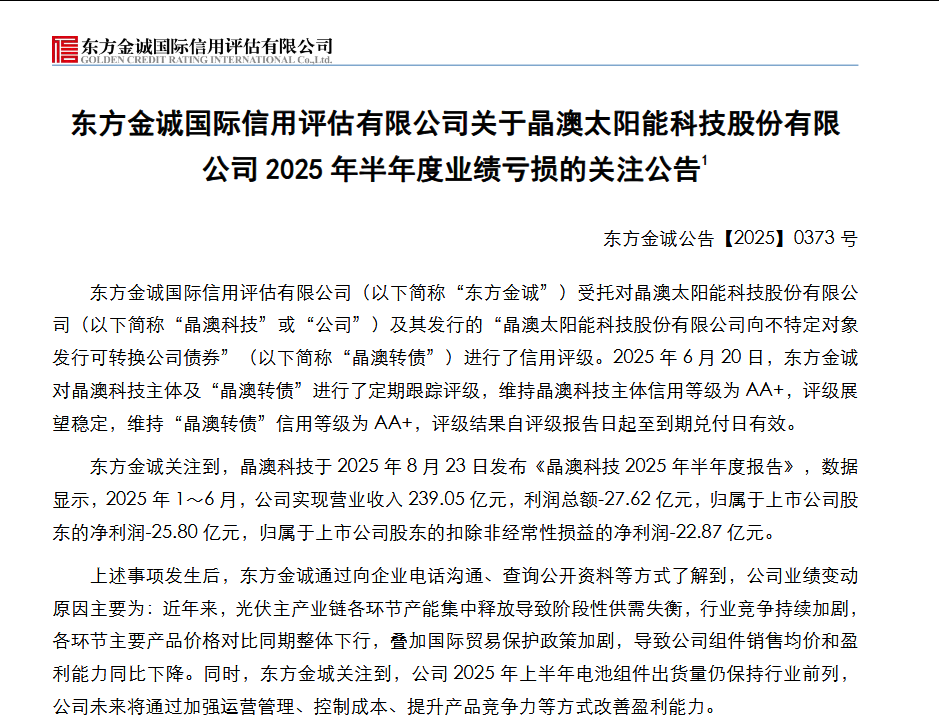 9月16日,东方金诚国际信用评估有限公司发布关注公告,就晶澳太阳能科技股份有限公司(以下简称“晶澳科技”)2025年上半年业绩亏损一事发表意见,光伏行业动态引发市场关注。