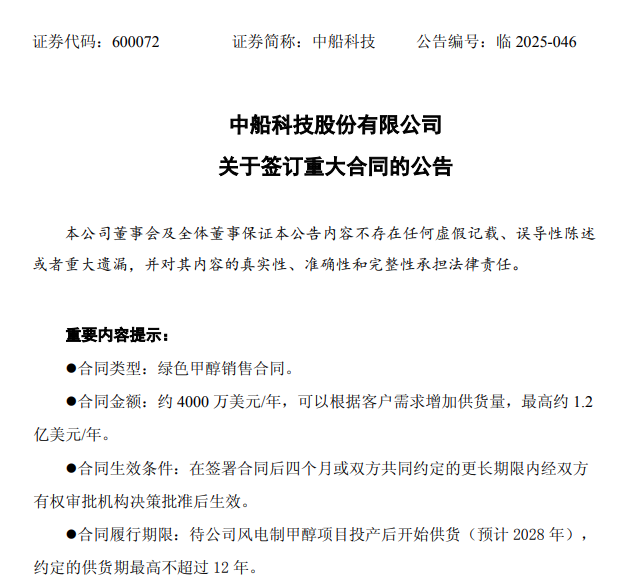 9月17日,中船科技(600072)发布公告称,公司联合中国船舶工业贸易有限公司子公司与客户A签订了绿色甲醇销售合同,合同金额约4000万美元/年,可根据客户需求增加供货量,最高约1.2亿美元/年(按当日汇率,约为8.54亿元人民币)。甲醇产业作为清洁能源领域的重要一环,正迎来新的发展机遇。