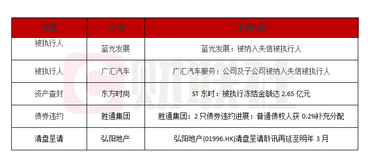 四川蓝光发展新增失信执行,半年度亏损25.52亿;广汇汽车董事长被限高消费,3只债券违约;ST东时被冻结2.65亿,半年度预计亏损超1亿;胜通集团2只债券违约,弘阳地产清盘聆讯延期。